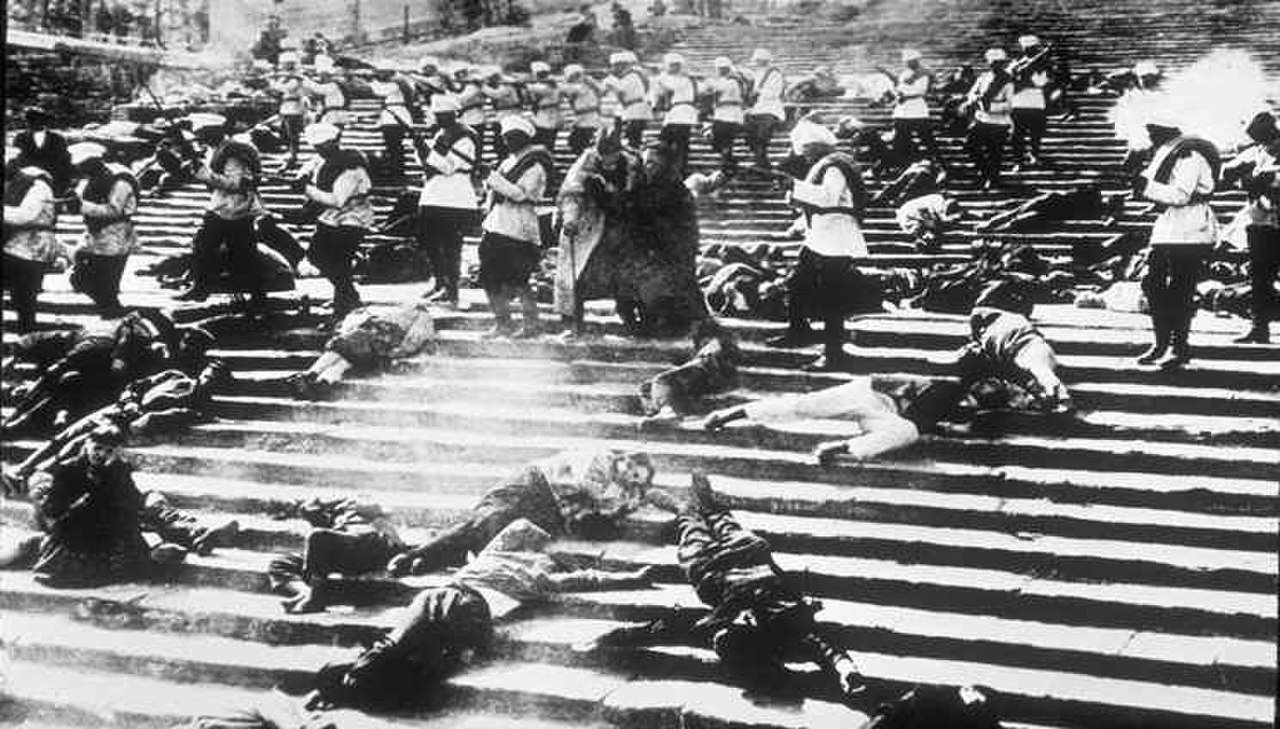 에이젠슈테인의 영화 중에서 <전함 포템킨>은 세계 영화사에서 빠짐없이 거론되는 중요한 영화입니다. 1905년에 일어난 혁명 20주년을 기념하여 만든 영화로 오데사에서 일어난 러시아 수병들의 반란을 소재로 만들어졌습니다. 무성 영화이면서 간간이 인물들의 말이 하나의 쇼트에서 글로 제시되는 방식으로 만들어진 이 영화는 ‘사람들과 구더기’, ‘갑판 위에서의 드라마’, ‘죽은 자는 호소한다’, ‘오데사 계단’, ‘함대와의 만남’이라는 제목을 단 다섯 개의 시퀀스로 이루어져 있습니다.. 전문적인 배우들이 아닌 일반인들이 집합적인 주인공을 연기한 군중 장면이 매우 자주 등장합니다.